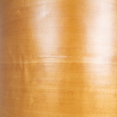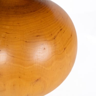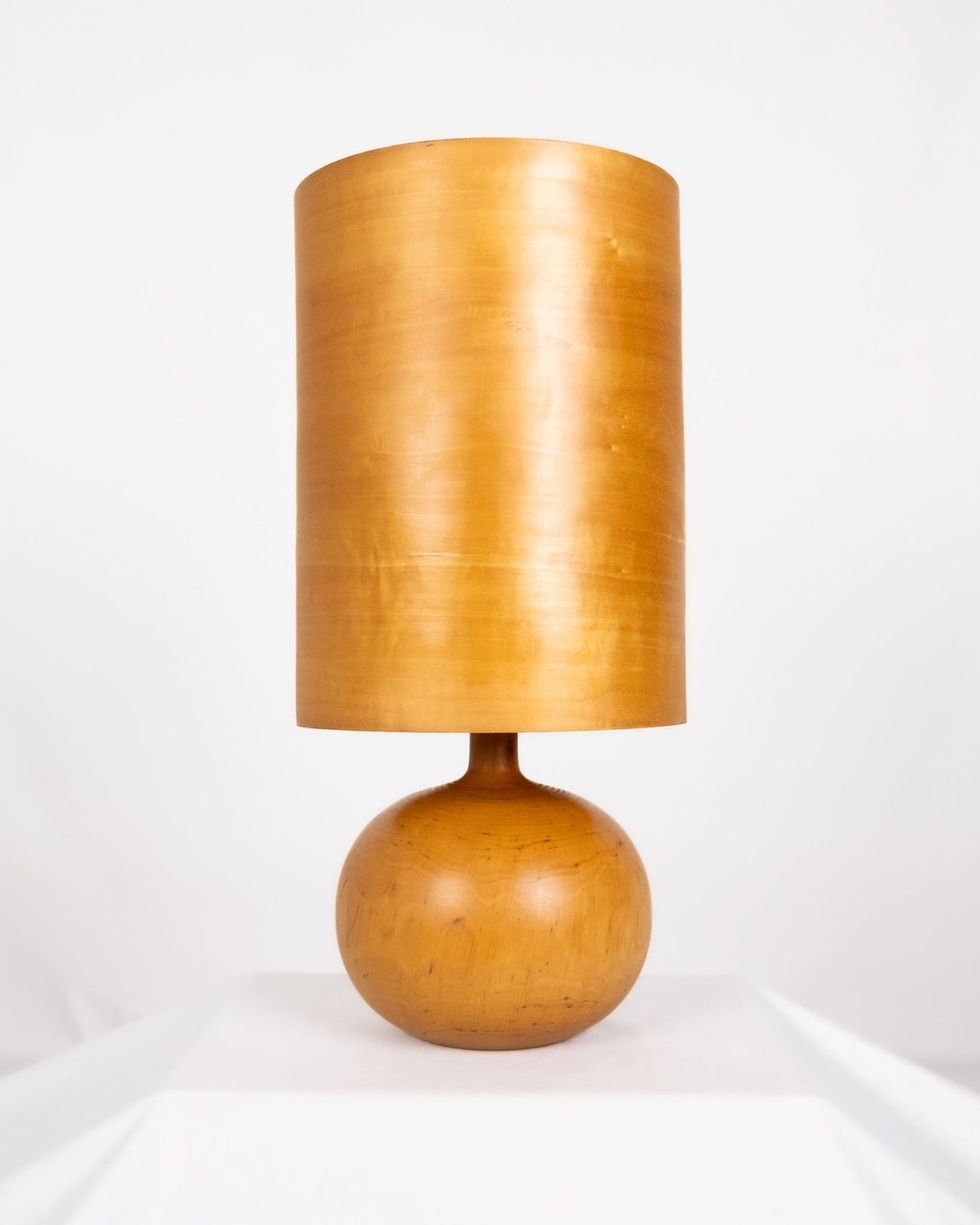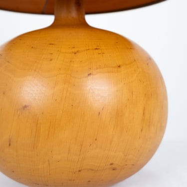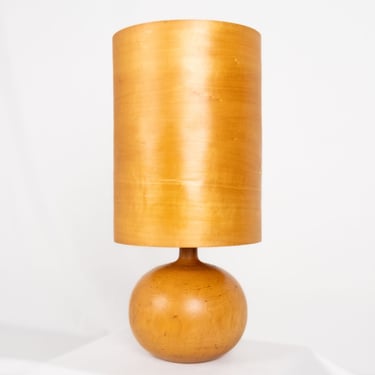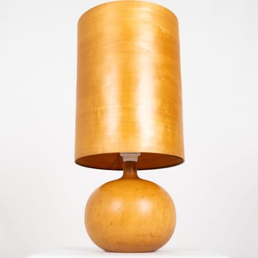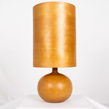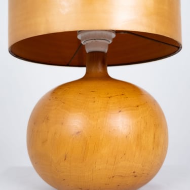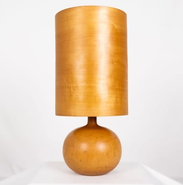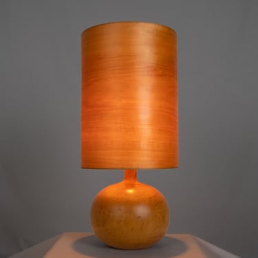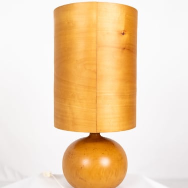 Pied de lampe boule en bois massif au très joli grain, abat-jour cylindrique également tout en bois, laissant passer une lumière tamisée et chaleureuse.
