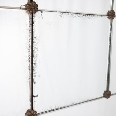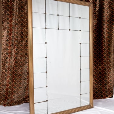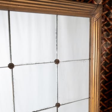 Constitué de 23 miroirs assemblés à l'aide de vis et cache-vis en forme de fleurs, en laiton. Cadre en bois et stuc doré. Dos en bois.