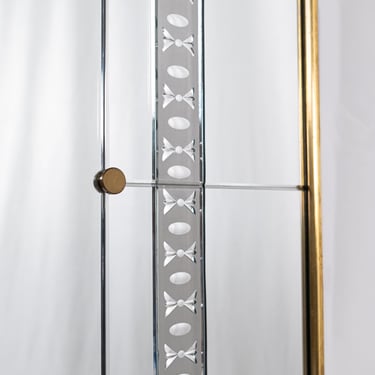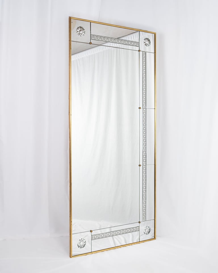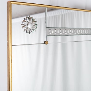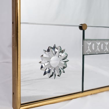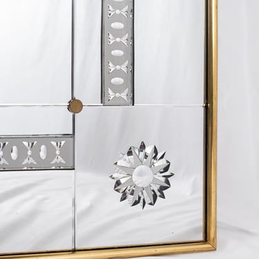Composed of ten engraved mirrors with beveled edges in varying sizes, assembled with brass screws and brass caps. The whole piece is mounted on a wooden structure with a gilt frame.