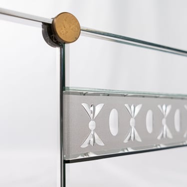 Composé de 10 miroirs gravés, aux bords biseautés, de dimensions variées, assemblés par des vis et cache-vis en laiton. L'ensemble est monté sur une structure et un cadre en bois doré.