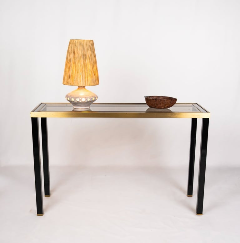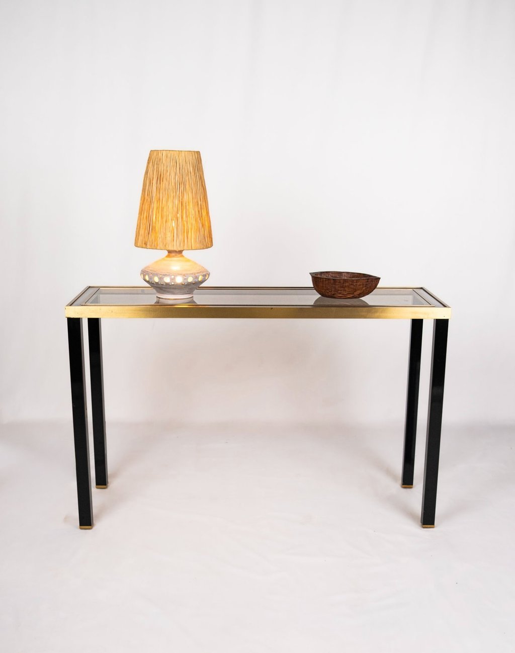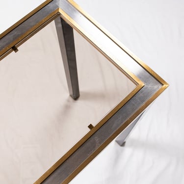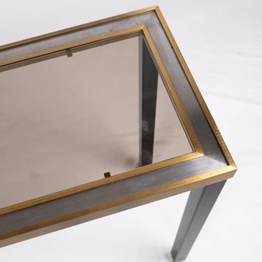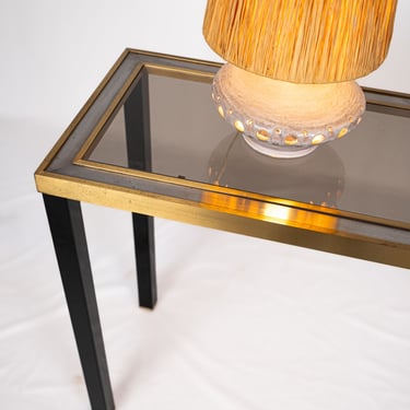 Métal brossé et laiton, plateau en verre fumé et piètement laqué noir avec sabots en laiton.
