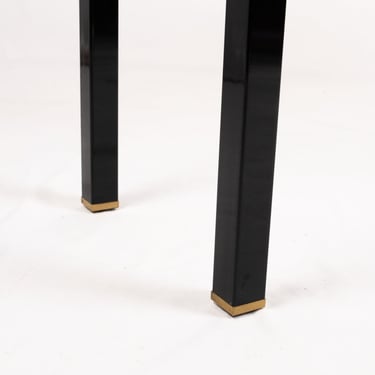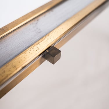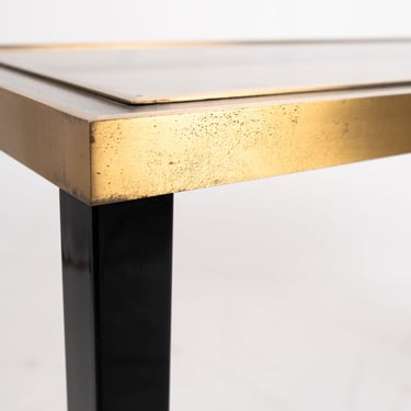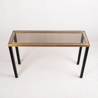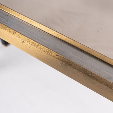 Brushed metal and brass, smoked glass top, and black lacquered base with brass feet.