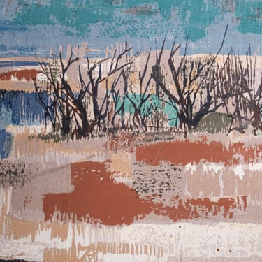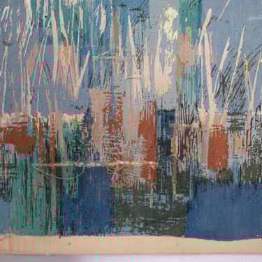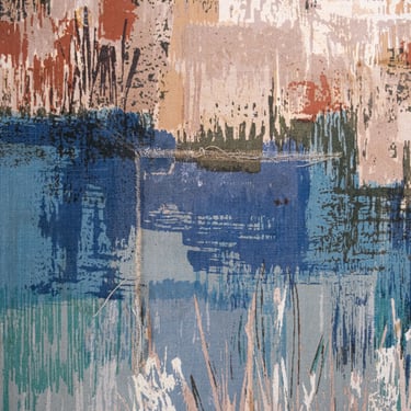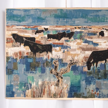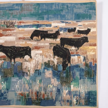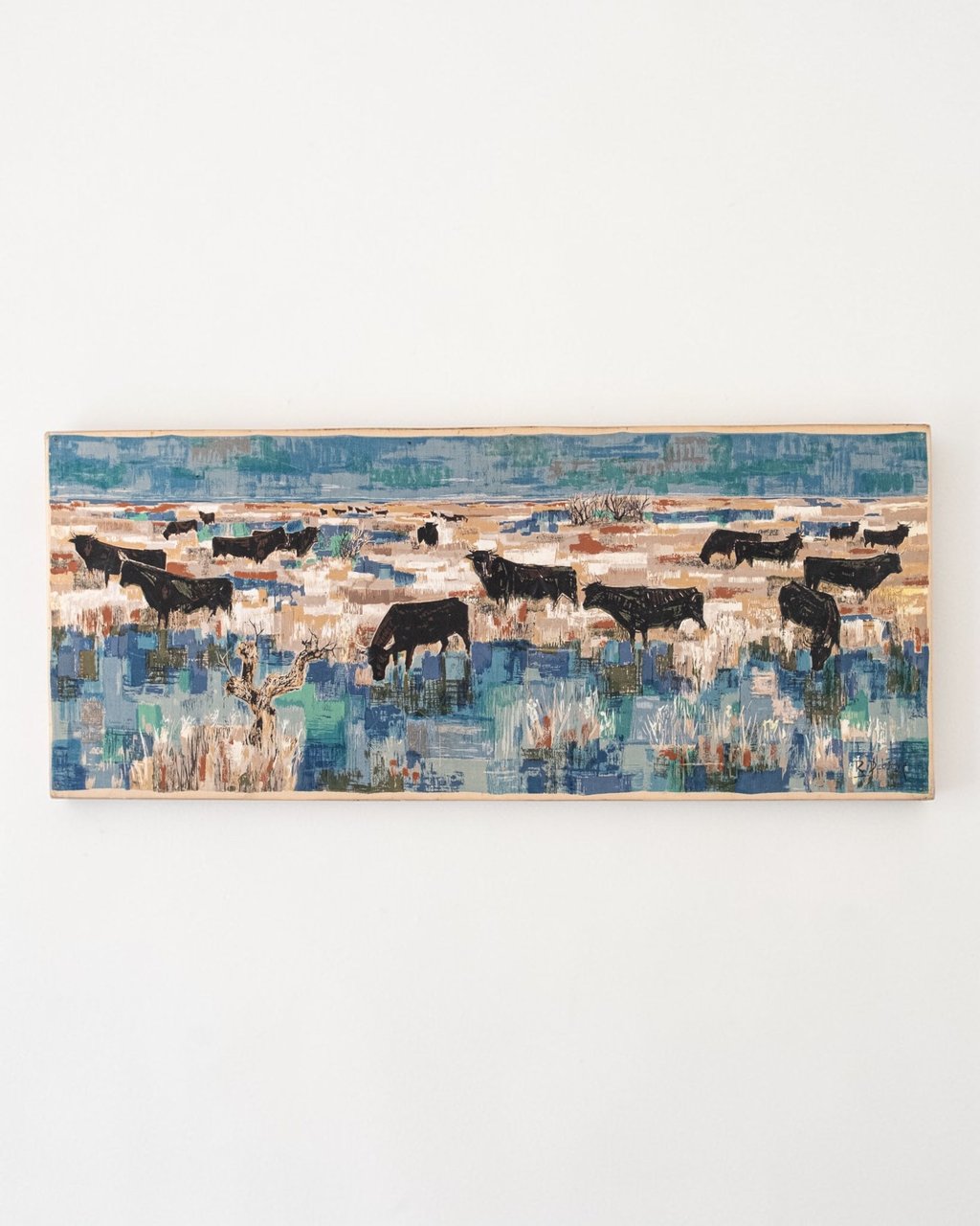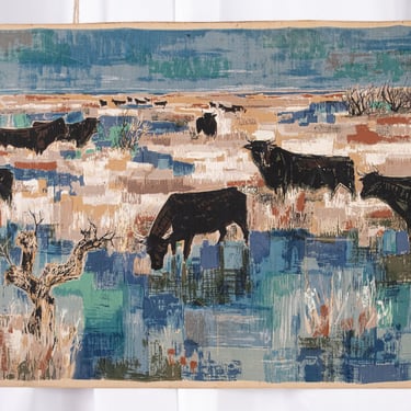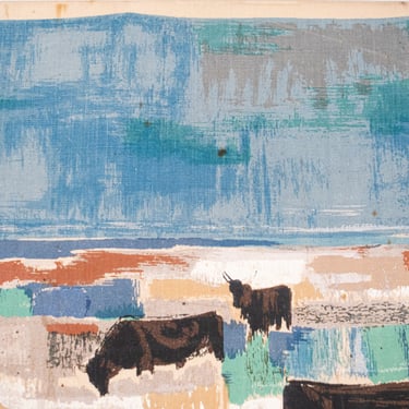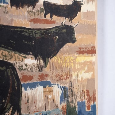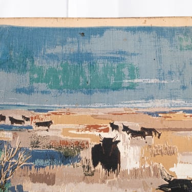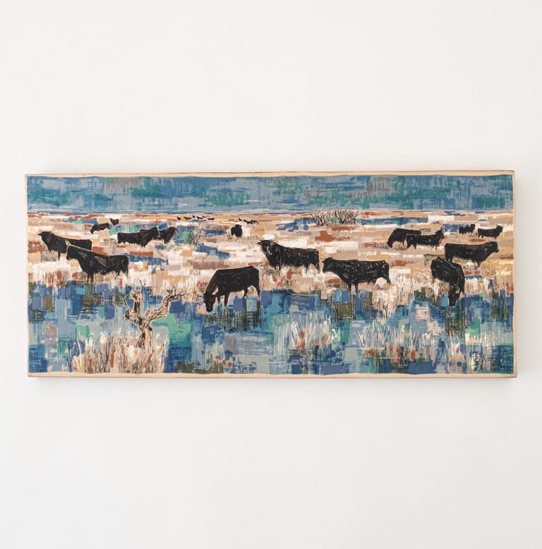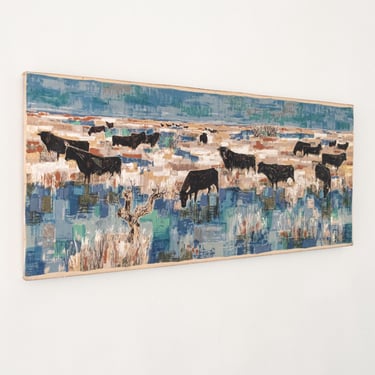 Cette oeuvre poétique représente un troupeau de taureaux dans un paysage de Camargue. Déclinée dans de délicates tonalités de beige et de bleu, elle se distingue par une impression sur tissu de grande qualité, aux détails fins et au rendu de couleurs particulièrement harmonieux.