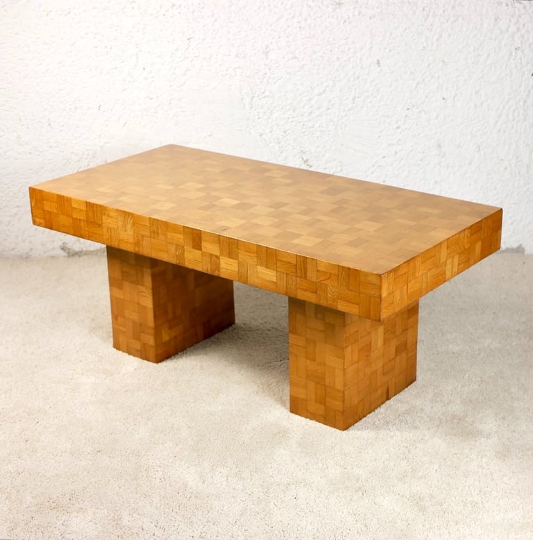 Stunning and rare coffee table from the 1970s, made entirely in oakwood marquetry.