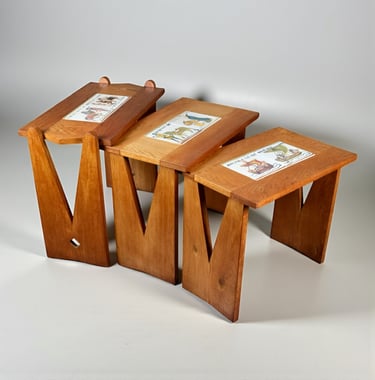 Very nice set of 3 nesting tables in solid oak and ceramic, by Guillerme et Chambron, for "Votre Maison" edition, made in France in the 1960s.