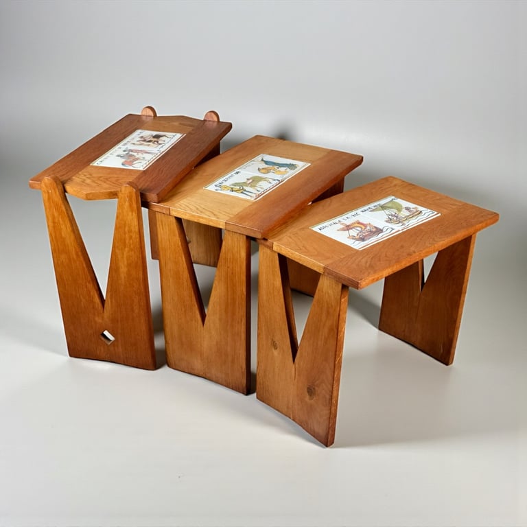 Très jolie série de trois tables gigognes en chêne massif et céramique, par Guillerme et Chambron, pour Votre Maison édition, des années 1960.