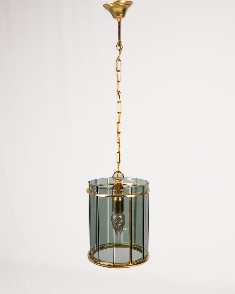 Lantern-style pendant featuring 12 glass facets, set on a gilt metal structure.