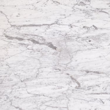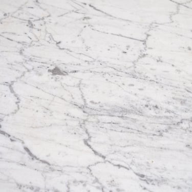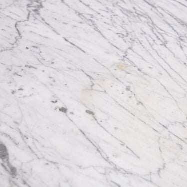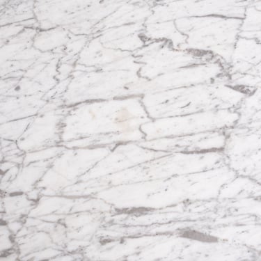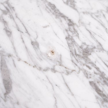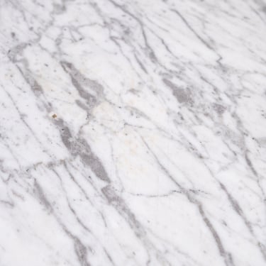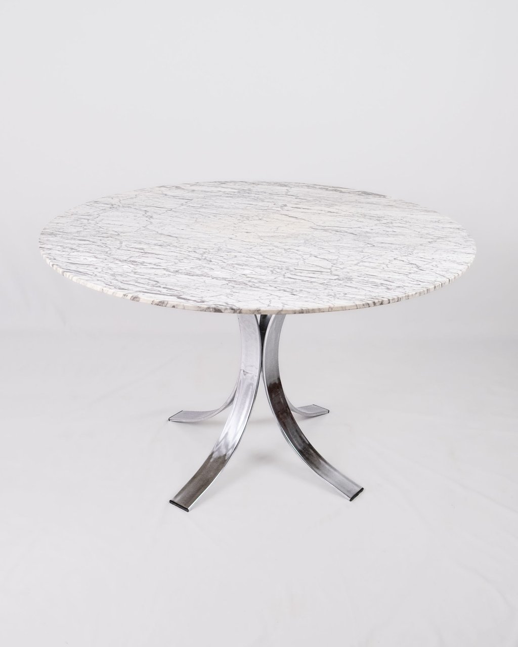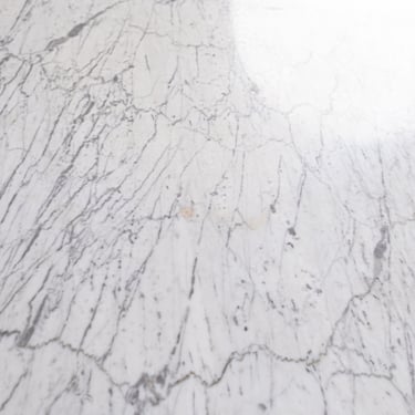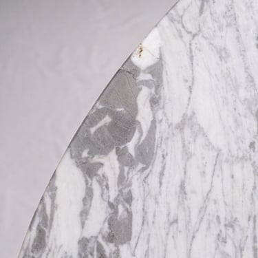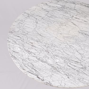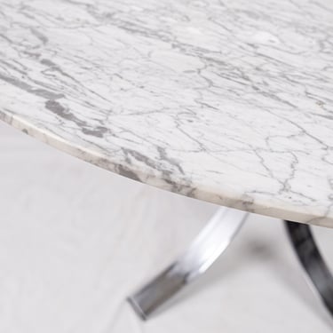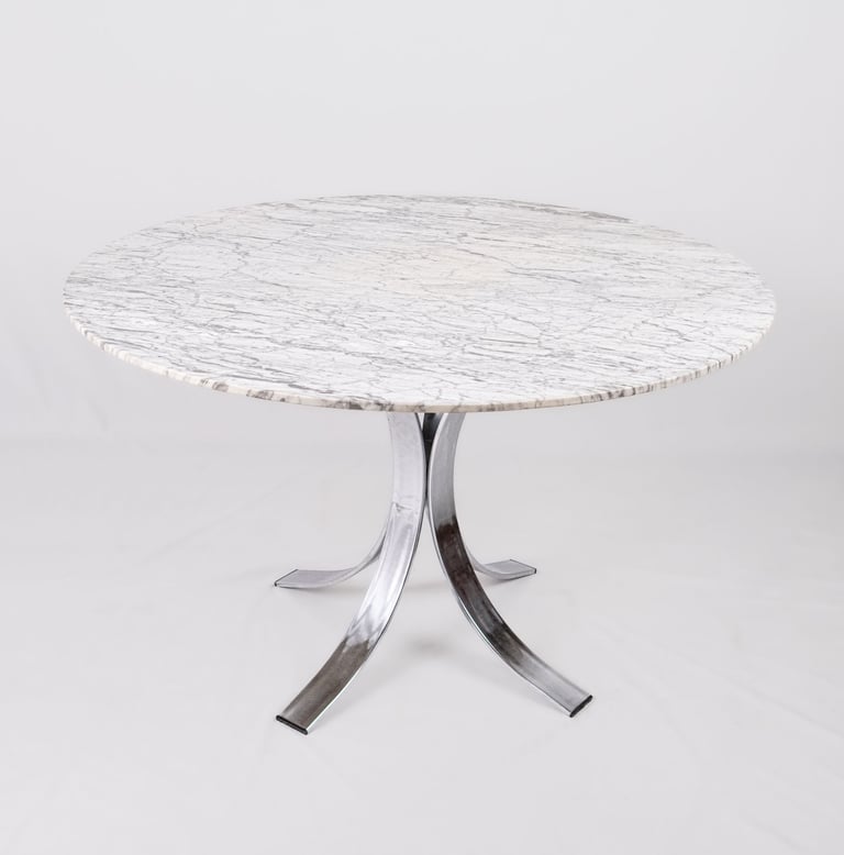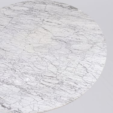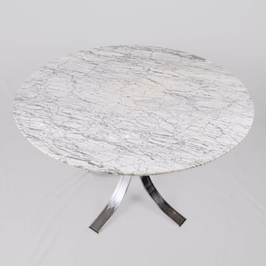 Elegant French round dining table from the 1970s–80s, featuring a refined veined marble top in subtle shades of grey.