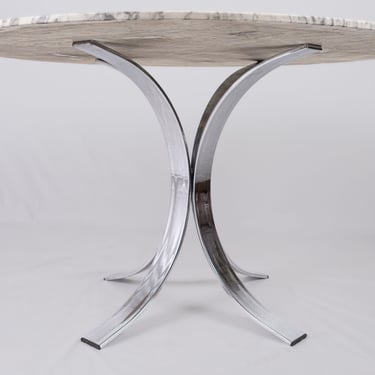Élégante association d'un plateau en marbre veiné dans des nuances de gris, et d'un piètement en métal chromé en forme de croix, au design à la fois sobre et graphique.