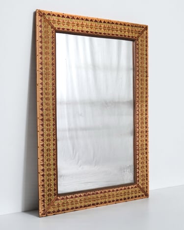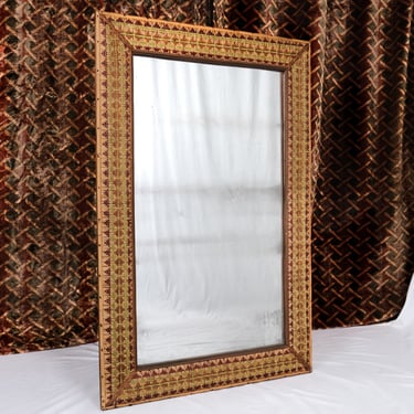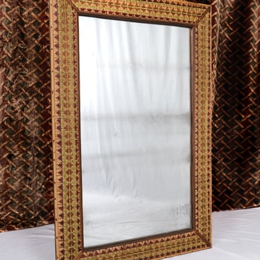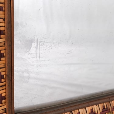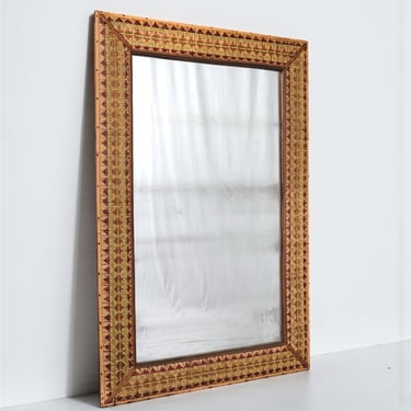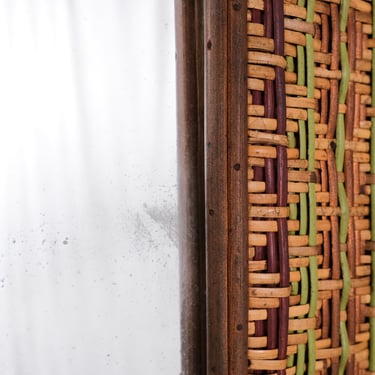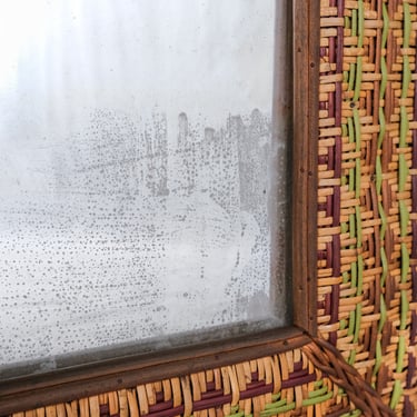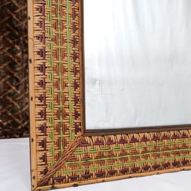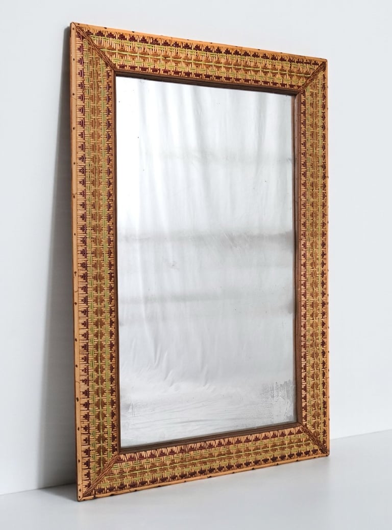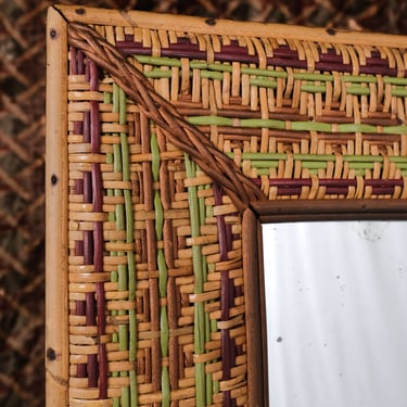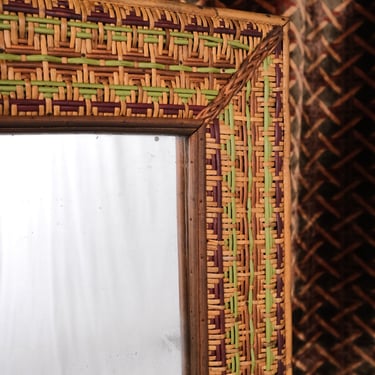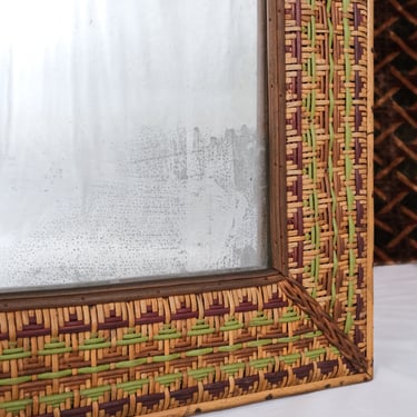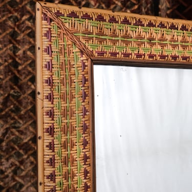 Rare miroir rectangulaire en rotin tressé multicolore, dans le style de Perret & Vibert, fabriqué en France au début du siècle, où l'appétence pour le style exotique battait son plein et où le rotin était fort apprécié.