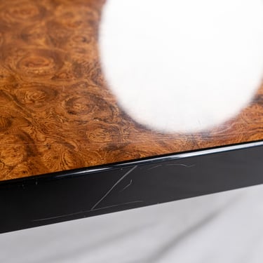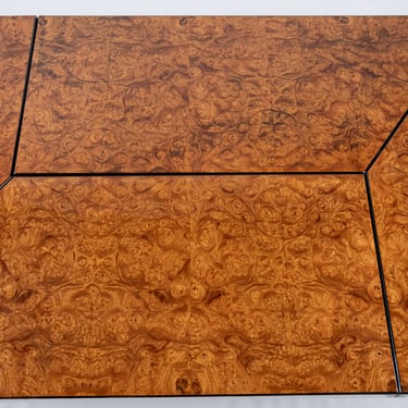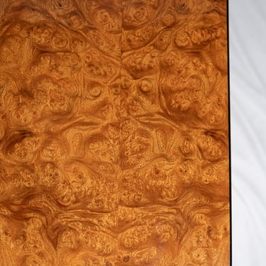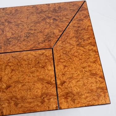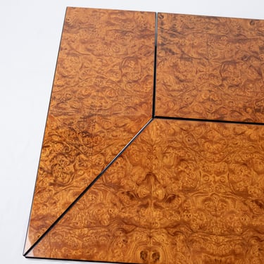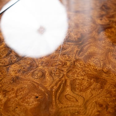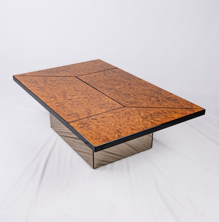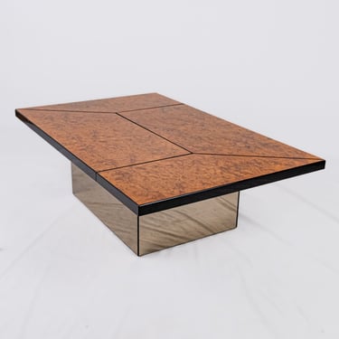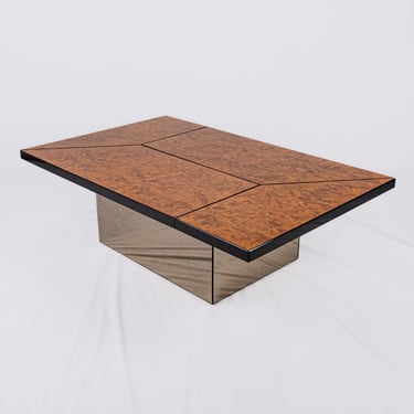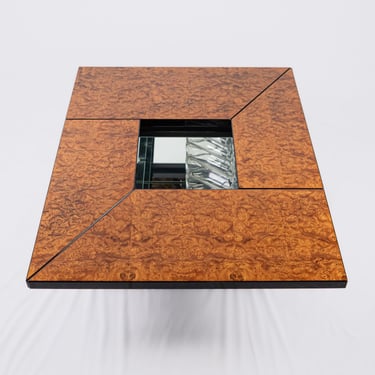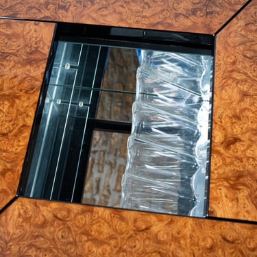 Mirrored central base in subtly pink-tinted smoked glass, with a lacquered elm burl sliding top.