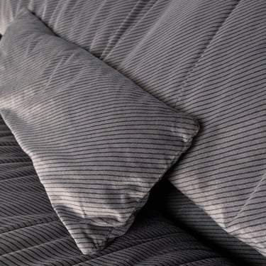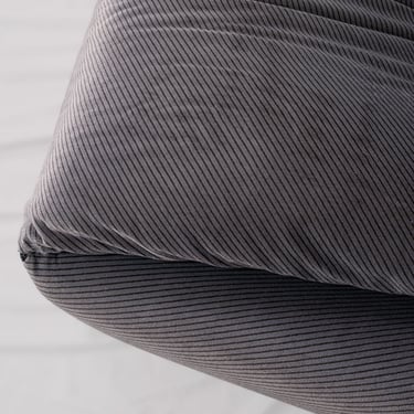 In grey velvet with brown diagonal stripes. Comes with two matching cushions. Fully removable covers.