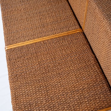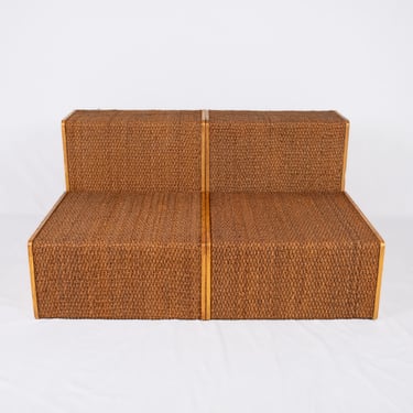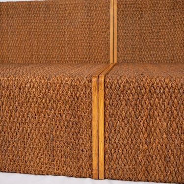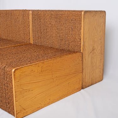 Chouette ensemble de quatre modules polyvalents en pin et corde, dans l'esprit d'Audoux et Minet. Réalisés sur mesure en France dans les années 1980 pour une boutique, ces éléments offrent une grande modularité.