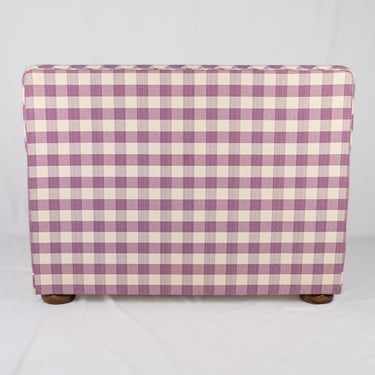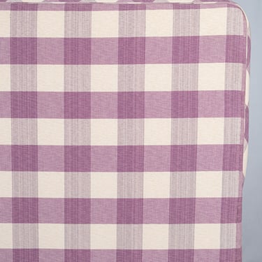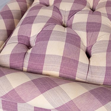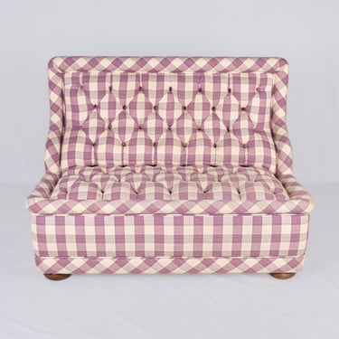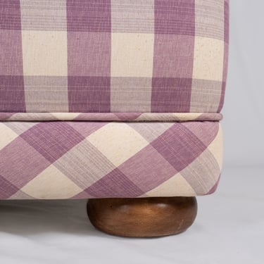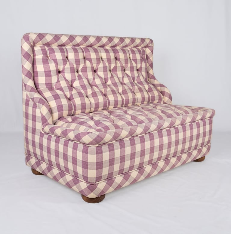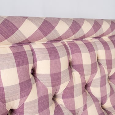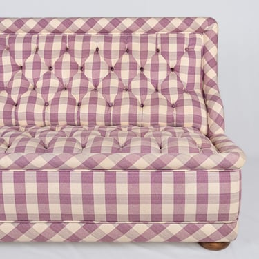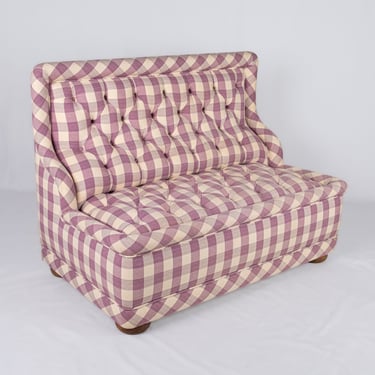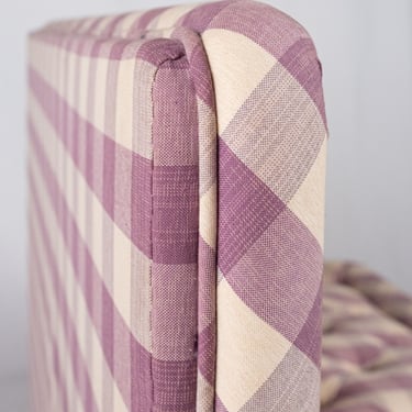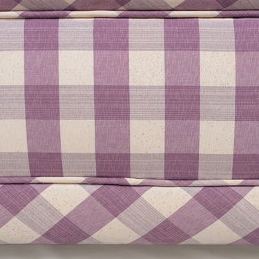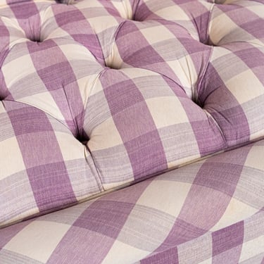 Adorable banquette capitonnée, habillée d'un tissu Vichy à large carreaux aux tons de mauve et crème, réalisée sur mesure en France dans les années 1970.