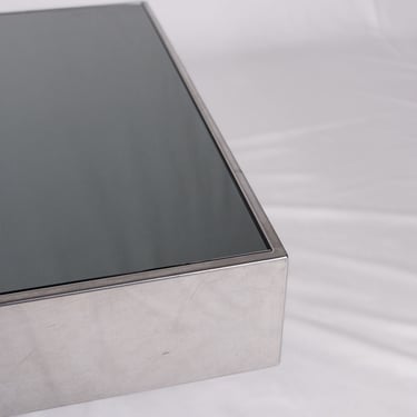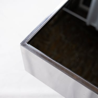 The piece rests on a rectangular wooden base finished in elegant black veneer, framed by a sleek chrome metal trim that adds a sophisticated contrast. The smoked mirrored glass top enhances its glamorous character, beautifully reflecting light while maintaining a subtle, atmospheric depth typical of 1970s design.