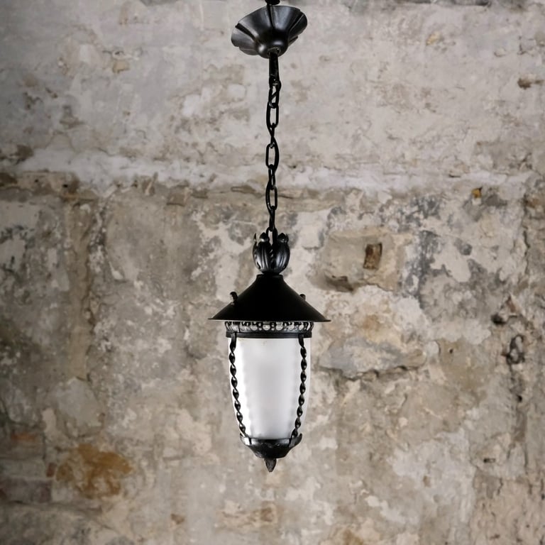 Jolie lanterne en fer forgé des années 1950, fabriquée en France.