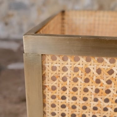 Cache-pot en plexi, cannage et laiton / Lucite, cane and brass plant pot