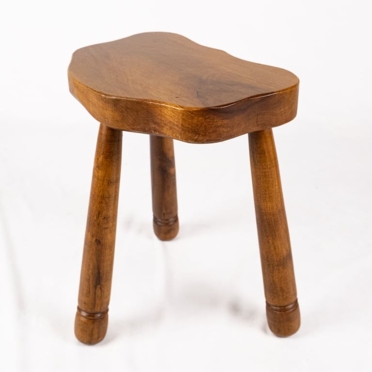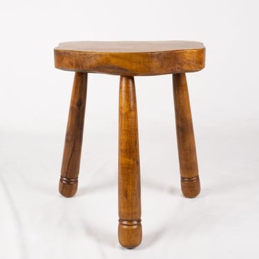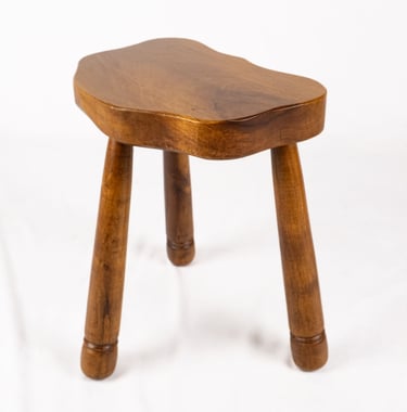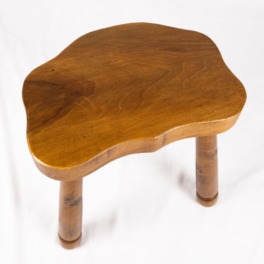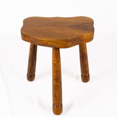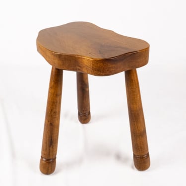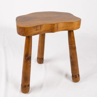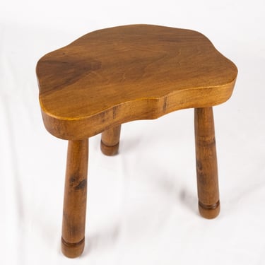 Tabouret en bois d'orme tripode, de forme libre, fabriqué en Bretagne dans les années 1950.
